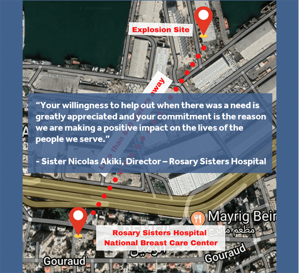 À la suite de la violente explosion du 4 août, la destruction était omniprésente dans les rues de Beyrouth, devenues méconnaissables. L’un des établissements les plus durement touchés fut l’Hôpital des Sœurs du Rosaire à Gemmayzé.
